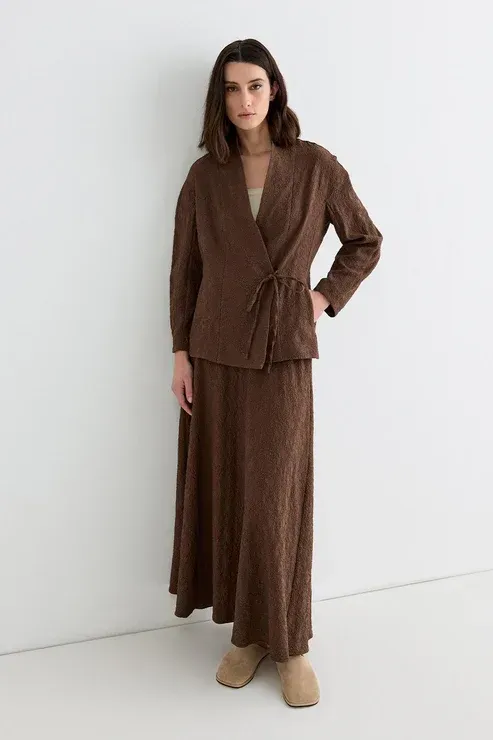 Ari dokulu ceket etek takım bordo, özel dokuma pamuk gofrili kumaşıyla hem şıklık hem de konfor sunar. V yaka tasarımı ve çan form etek kesimi, vücuda dengeli bir uyum sağlayarak zarif bir siluet oluşturur. Ceketin biyeli bağlama detayı modern bir dokunuş katarken, yüksek bel arkadan lastikli eteği ile hareket özgürlüğü sağlar. Özel günlerinizde zarif bir bluz ve topuklu ayakkabılarla tamamlayarak sofistike bir görünüm elde edebilir, sade aksesuarlarla minimal bir stil yaratabilirsiniz. Zamansız tasarımıyla her dolabın vazgeçilmezi olacak bir takım!