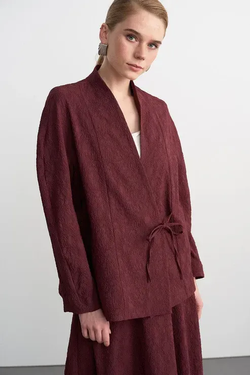 Ari dokulu ceket etek takım bordo, özel dokuma pamuk gofrili kumaşıyla hem şıklık hem de konfor sunar. V yaka tasarımı ve çan form etek kesimi, vücuda dengeli bir uyum sağlayarak zarif bir siluet oluşturur. Ceketin biyeli bağlama detayı modern bir dokunuş katarken, yüksek bel arkadan lastikli eteği ile hareket özgürlüğü sağlar. Özel günlerinizde zarif bir bluz ve topuklu ayakkabılarla tamamlayarak sofistike bir görünüm elde edebilir, sade aksesuarlarla minimal bir stil yaratabilirsiniz. Zamansız tasarımıyla her dolabın vazgeçilmezi olacak bir takım!