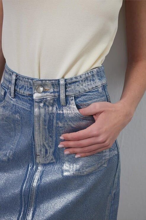 Parlak baskı sıvamalı denim kalem etek silver, sıradanlığın dışına çıkmak isteyen,hem rahat hem benzersiz stil arayanlar için en ideal seçim. Kalıp formu sayesinde daha zayıf ve uzun görünmenize yardımcı olacaktır.