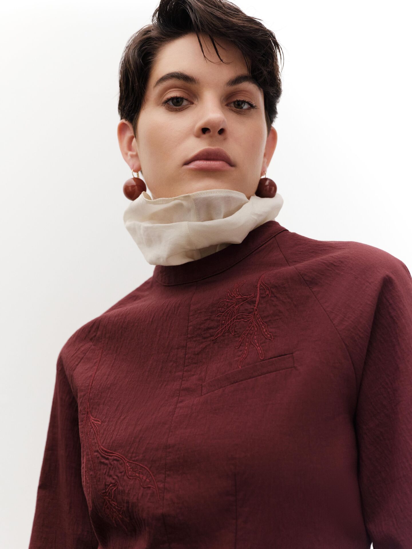 Zarif nakış detaylarıyla karakter kazanan bu bluz, modern ve sofistike bir silueti geleneksel el işçiliği ile buluşturuyor. Dokulu kumaşı sayesinde hem hafif bir hacim etkisi yaratır hem de tasarımın özgün çizgisini öne çıkarır. Göğüs ve beden kısmındaki ince nakış işlemeleri, minimalist formu sanatsal bir dokunuşla tamamlar.
