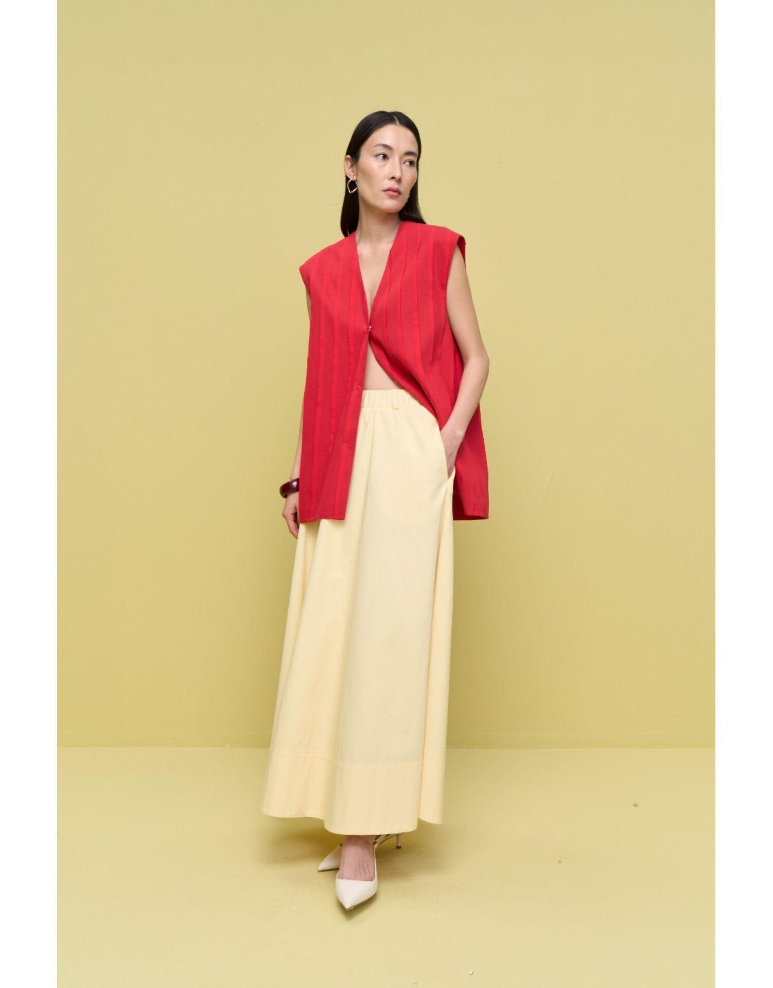 Belden büzgülü, düz kesim. Etek ucu geniş pervazlı etek.
