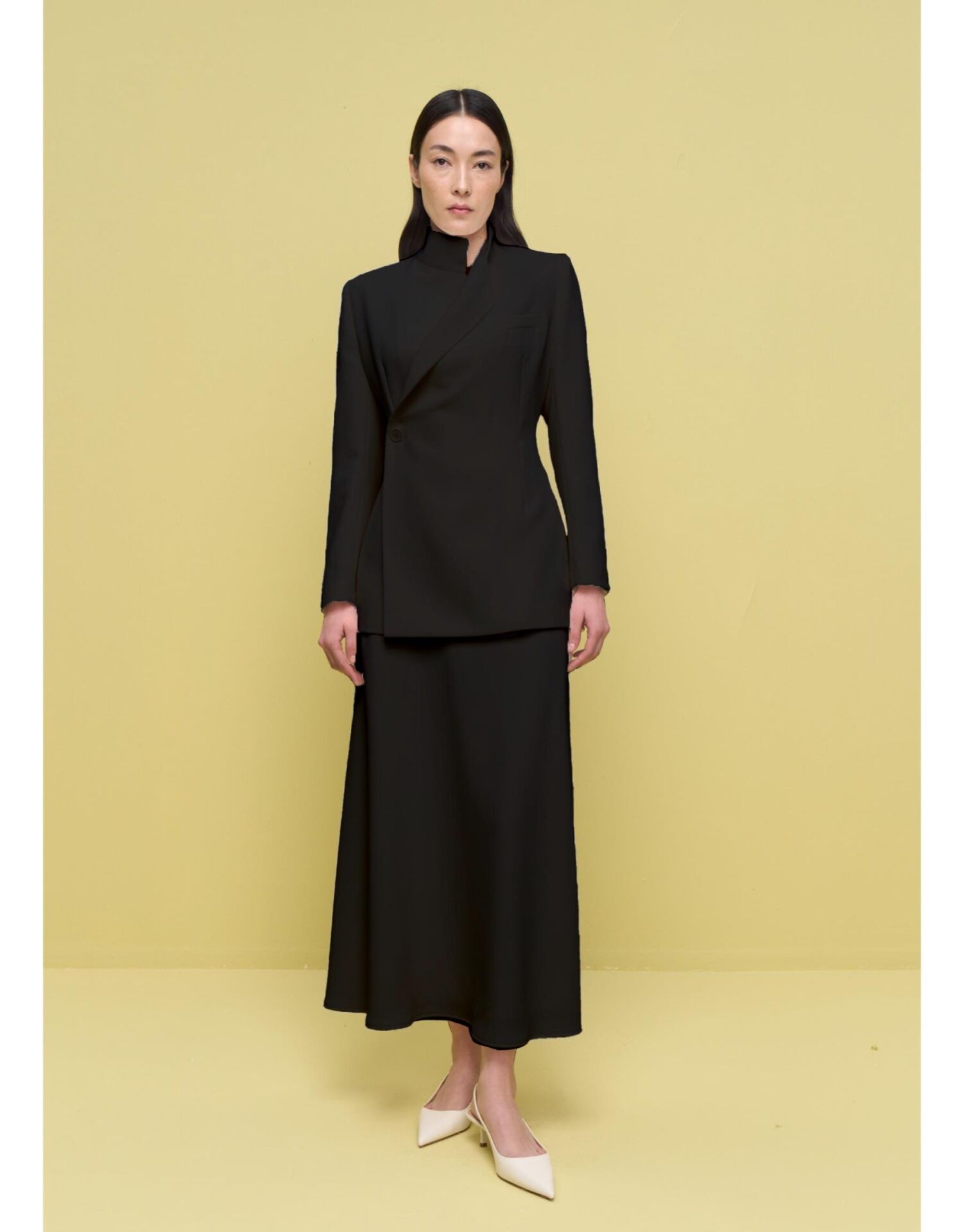 Yandan kapamalı, pensli düz ceket.